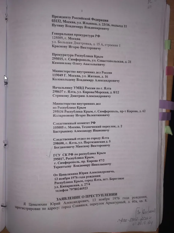 10.08.2024 г. сотрудниками ОЭБ и ПК УМВД России по г. Ялта опрошен Исиков Иван Викторович, с которым якобы 01.04.2016 г. был заключен договор подряда № 4/4/16 и подписан акт выполненных работ на сумму 482 266,00 руб. в пансионате «Кастрополь». В ходе пояснений он сообщил, что в 2018 году отдыхал в пансионате, где у него украли копию паспорта. Договор подряда, акт выполненных работ он не подписывал, ремонтные работы не выполнял, деньги в размере 482 266,00 руб.не получал; с Цевалихиным Ю.А. не знаком. Исиков И.В. подал заявление в полицию о мошенничестве № 3/258200650772 со стороны директора АНО «Содействие» Цевалихина Ю.А., указав, что является капитаном корабля, а не строителем. Заявление о преступлении правоохранительные органы проигнорировали.