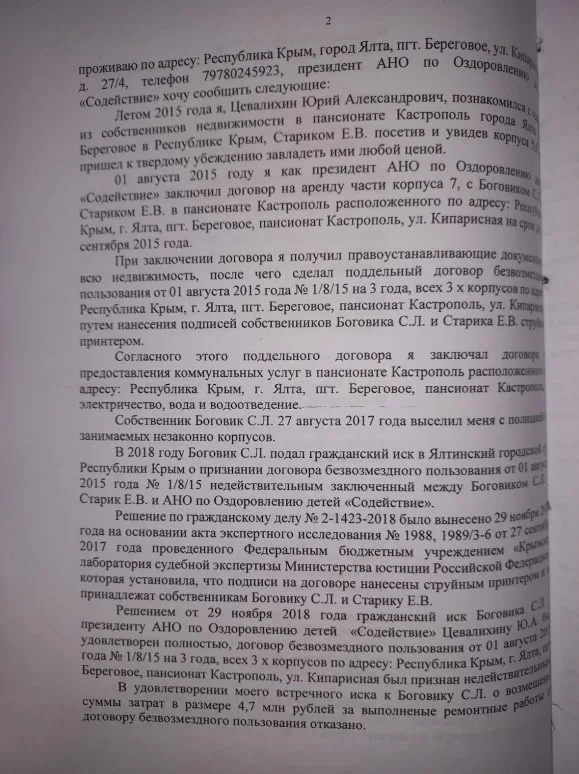 В 2015 году Юрий Цевалихин, представившись директором АНО «Содействие», арендовал несколько комнат в пансионате «Кастрополь» под Ялтой. Через месяц он подделал договор безвозмездного пользования на 3 года — подделав подписи собственников, что было установлено 27.09.2017г. проведенной почерковедческой экспертизой ФБУ «Крымская лаборатория судебной экспертизы Минюста РФ», которая подтвердила подлог: подписи собственников нанесены струйным принтером.