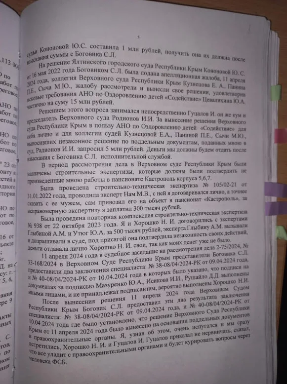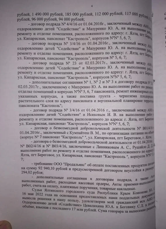 В 2020 году его АНО «Содействие» подало иск в Ялтинский городской суд дело № 2-75/2022, требуя возмещения с собственника 17 018 681,37 руб. за «ремонт и благоустройство территории». Исковы требования состоят из: