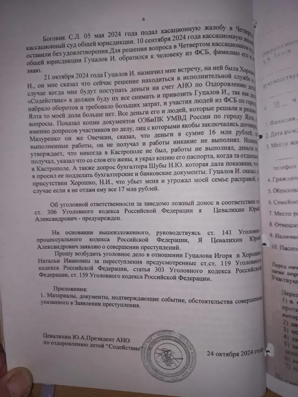 Лица, пострадавшие от мошеннической группы были вынуждены обратиться с жалобой в ЕСПЧ. Согласно «Заявлению о преступлении от 24 октября 2024 года» поданную президентом АНО «Содействие», Цевалихин Ю.А. указывает всех членов мошеннической группы, в которую входят: Цевалихин Ю.А., Хорошко Н.В., Гуцайло И.В., Кононова Ю.С., Кузнецова Е.А., эксперты Глыбина А.М,, Утюг Ю.А., Родионов И.И., работники правохранительных органов и другие.